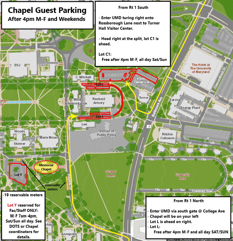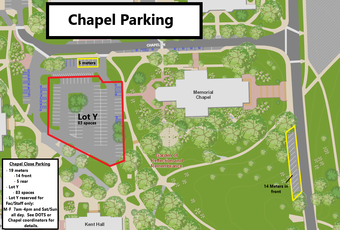 Free parking is available in Lots Y, L, and C. The lots are labeled in the images below. If parking is not available at the Chapel (Lot Y), please drop off your senior and disabled guests prior to proceeding to Lot L.